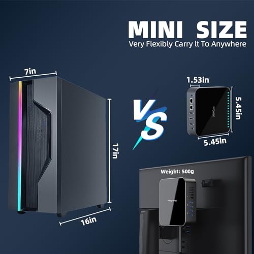 【Compact Size】Mini pc with small size:5.45’‘L,5.45’‘W,1.45’‘H, light weight only 500g,compact, space-saving, portable, can be VESA-mounted on the back of a display.
