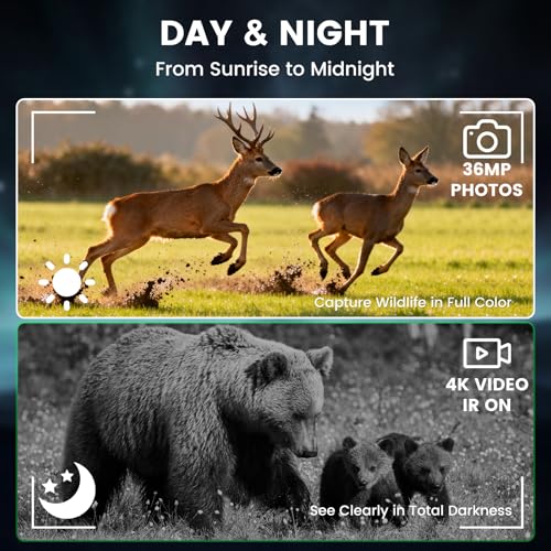 Day & Night Vision with 4K Video Recording: Designed for low-light and pitch-dark environments, these night vision goggles support clear 4K video recording and detailed 36MP photo capture. Premium optics and anti-shake design help you capture moving wildlife or distant targets with confidence—ideal for hunting, nighttime wildlife observation, and security surveillance