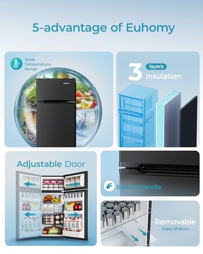 COMBINATION OF FRIDGE-FREEZER – Euhomy mini fridge with freezer combines the advantages of fridge and freezer to design the dorm fridge with freezer 2 doors. It has two storage zone at the same time. Small fridge can be used to store frozen food, preserve fresh fruits or vegetables