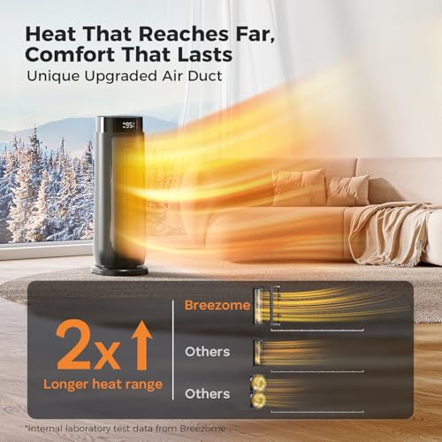 FAST & EFFICIENT HEATING: The Breezome space heater boasts an enhanced PTC element coupled with advanced turbocharger technology, allowing it to generate heat almost instantly and spread warm air more effectively. With its 90° wide-angle oscillation and extended wind wheel, it can significantly increase the heating coverage, making it perfect for areas up to 250 square feet.